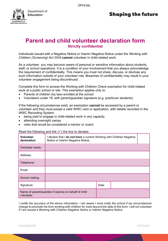 For grandparents or other relatives of students who would like to volunteer, you are required to hold a Volunteer Working With Children Check. You can pick up an application form from any Australia Post office or apply online. The cost is approximately $11.00. Grandparents and other relatives must present their Working With Children Card when signing in at the office. They must also complete the school safety induction via the QR code.